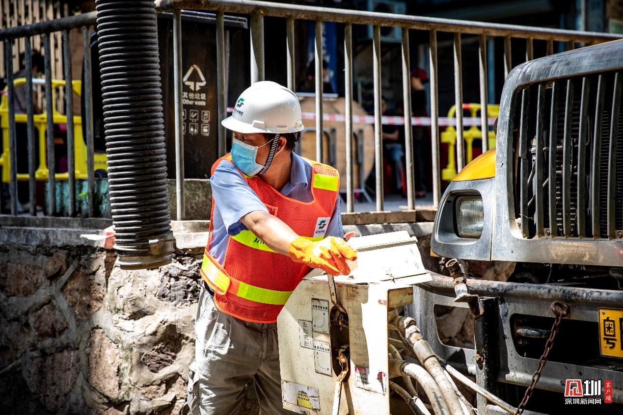 南山分公司清疏隊(duì)隊(duì)員方衛(wèi)星,正回頭專注地等待著指令,以及時(shí)啟動(dòng)抽水機(jī)。