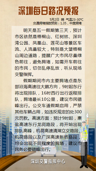 由于市民出行意愿較強(qiáng)烈,預(yù)計(jì)明日市內(nèi)熱門商圈、景區(qū)、公園的車流量壓力仍較大,大鵬、鹽田等濱海景區(qū)車流量將會(huì)持續(xù)增加。