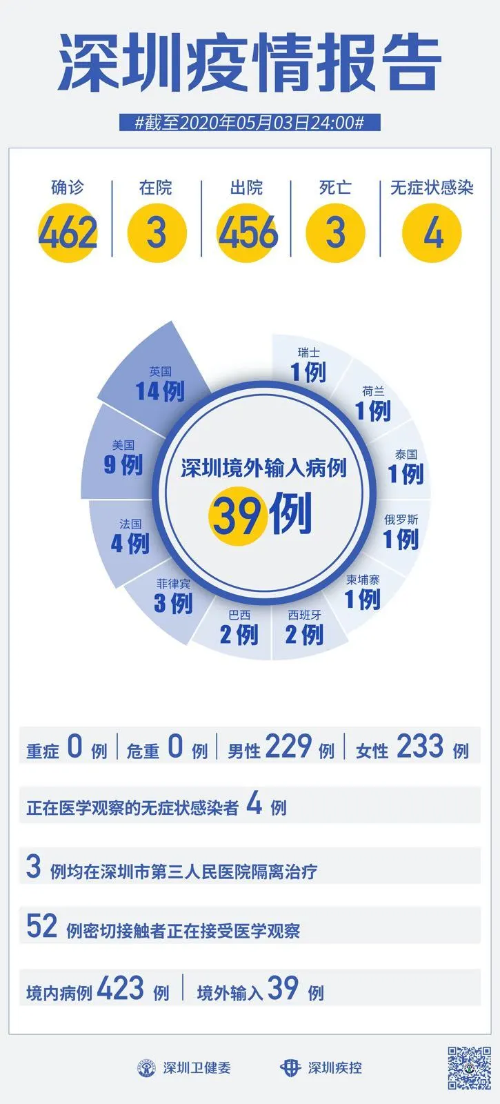 截至5月3日24時(shí),深圳累計(jì)報(bào)告新冠肺炎病例462例。5月3日當(dāng)天新增出院1例。