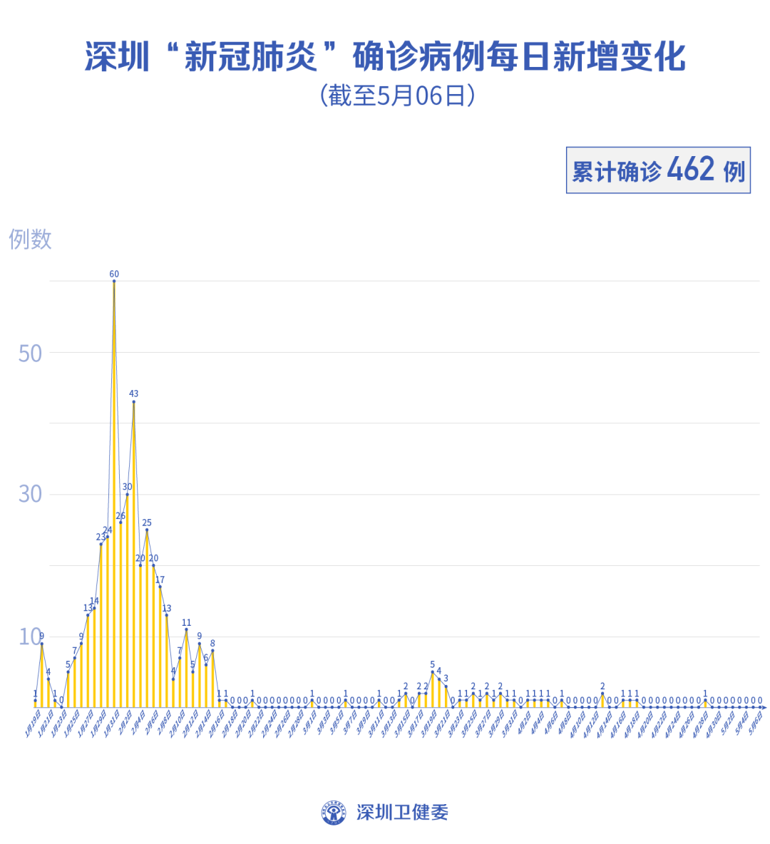 截至5月6日24時,深圳累計(jì)報(bào)告新冠肺炎病例462例。在院治療僅有1例。