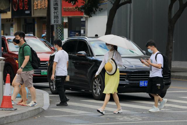 ▲走在街上,熱浪撲面而來(lái),耀眼的陽(yáng)光把人曬得睜不開眼,行人紛紛拿起手頭物品遮擋烈日。
