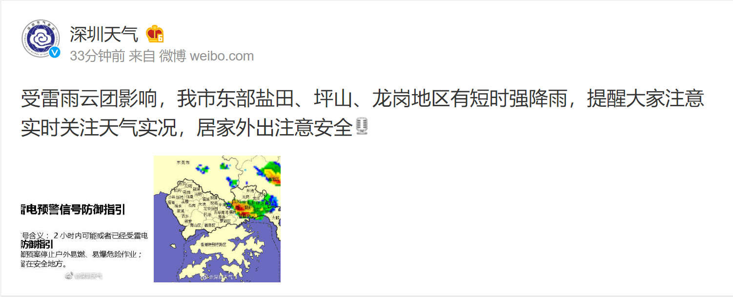 目前,受雷雨云團(tuán)影響,深圳東部鹽田、坪山、龍崗地區(qū)有短時(shí)強(qiáng)降雨。