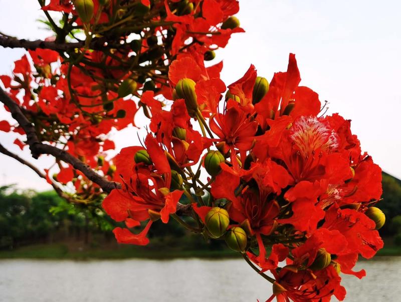 鳳凰木又名火樹、紅花楹,由于其開花時(shí)"葉如飛凰之羽,花若丹鳳之冠",因而得名「鳳凰樹」。每年5月至7月,是鳳凰樹開花的時(shí)節(jié)。在鵬城公園、道路兩旁到處可見鳳凰花盛開,當(dāng)下鳳凰花開正燦爛,錦簇花團(tuán)紅似火,成為鵬城亮麗的風(fēng)景線。圖為龍崗大運(yùn)中心鳳凰樹花開吸引市觀賞拍照。