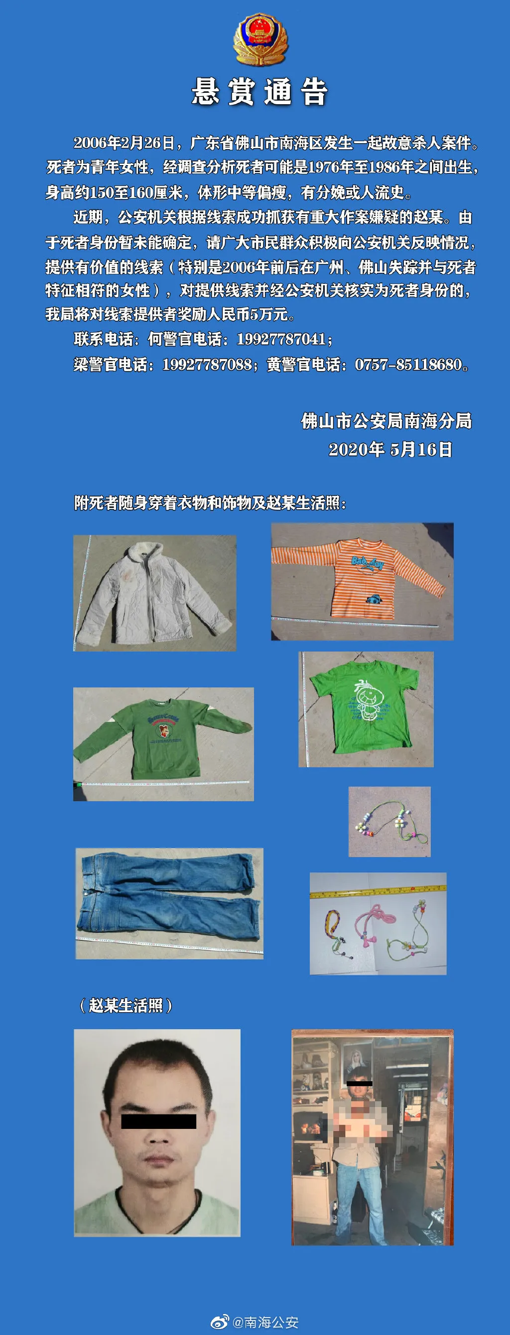 近期,公安機(jī)關(guān)根據(jù)線索成功抓獲有重大作案嫌疑的趙某。由于死者身份暫未能確定,請(qǐng)廣大市民群眾積極向公安機(jī)關(guān)反映情況,提供有價(jià)值的線索(特別是2006年前后在廣州、佛山失蹤并與死者特征相符的女性),對(duì)提供線索并經(jīng)公安機(jī)關(guān)核實(shí)為死者身份的,將對(duì)線索提供者獎(jiǎng)勵(lì)人民幣5萬(wàn)元。