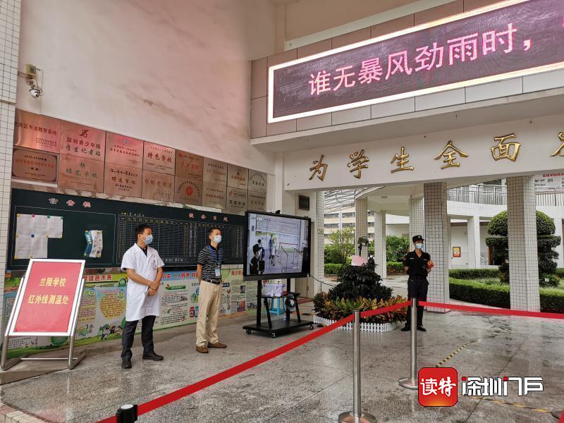 南山區(qū)科創(chuàng)學校,安保人員正在為返校的學生測量體溫。