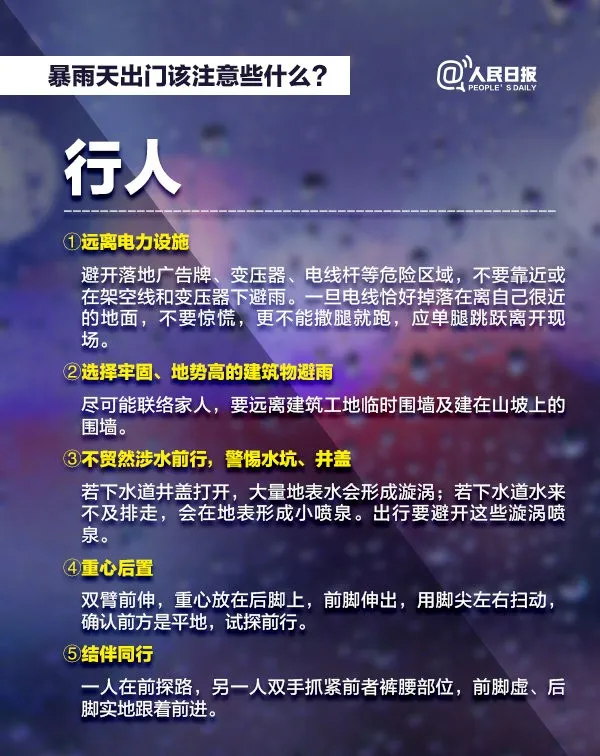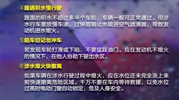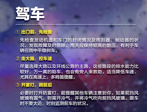 √雨天路滑,注意車(chē)輛行駛安全,控制車(chē)速防止追尾等事故的發(fā)生,繞開(kāi)積水隧道涵洞和城市低洼區(qū)域,防止跌入窨井、地坑,不要在深水區(qū)逗留。