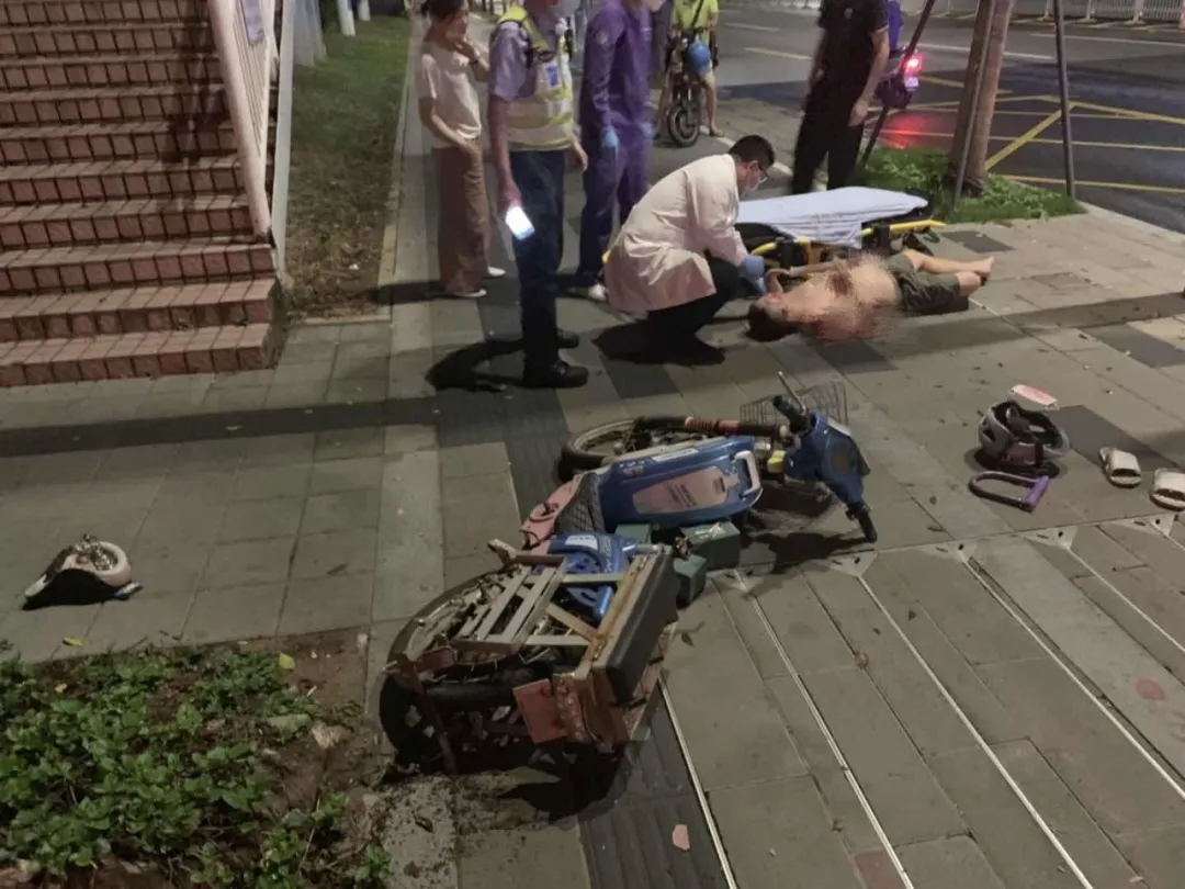 該男子上半身裸露橫躺在人行道上,而且臉上、身上多處擦傷,右眼淤青紅腫,旁邊還有一輛損壞的兩輪電動(dòng)車(chē),坐墊、鎖鏈、頭盔散落一地。