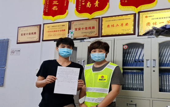 見圳客戶端·深圳新聞網(wǎng)2020年6月9日訊(深圳特區(qū)報(bào)記者 徐興東)6月9日早上,一位自稱劉先生的年輕人冒著滂沱大雨來到了西部公汽寶永車隊(duì)。一進(jìn)辦公室,劉先生雙手捧著將親筆寫的一封感謝信呈給了隊(duì)助張喜鳳,并深有感觸地說道:“多災(zāi)多難的父親有幸遇到乘務(wù)員鄭錄蓮的熱心幫助,并想方設(shè)法聯(lián)系上我。謝謝你們的成全,才讓我在父親節(jié)即將到來之時還能叫一聲爸爸,我將終生銘記諸位的大恩大德!”樸實(shí)無華的話語,感染了在場的每一個人,分明看出個個眼里都閃爍著晶瑩的喜悅淚花。