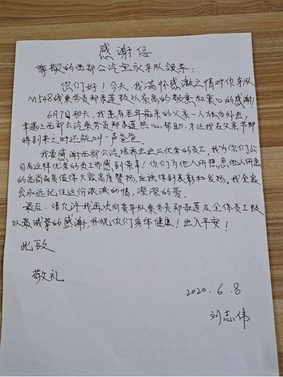 6月9日早上,一位自稱劉先生的年輕人冒著滂沱大雨來到了西部公汽寶永車隊(duì)。一進(jìn)辦公室,劉先生雙手捧著將親筆寫的一封感謝信呈給了隊(duì)助張喜鳳。