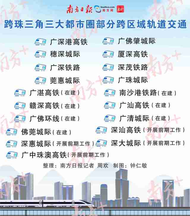 廣州、深圳“CP感”滿滿,通過廣深港高鐵、穗深城際、廣深鐵路等快速互聯(lián),最快半小時(shí)互通。而廣州地鐵28號線將連接佛山、廣州、東莞,支線還擬延伸至惠州。廣州地鐵18號線則規(guī)劃深入中山、珠海。肇慶、中山、江門、佛山等也紛紛“到深圳去”……