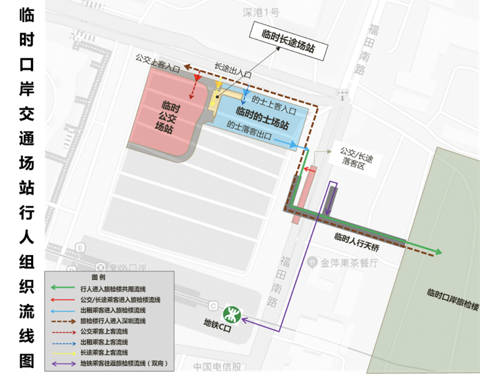 目前,臨時(shí)口岸配套交通設(shè)施已陸續(xù)完成建設(shè),已達(dá)到啟用條件,計(jì)劃于6月24日啟用。為保障臨時(shí)口岸使用期間口岸片區(qū)交通運(yùn)行順暢,市交通運(yùn)輸局福田管理局制訂了臨時(shí)公交、的士及交通場(chǎng)站轉(zhuǎn)場(chǎng)方案以及片區(qū)交通疏導(dǎo)方案,為廣大市民出行提供指引。