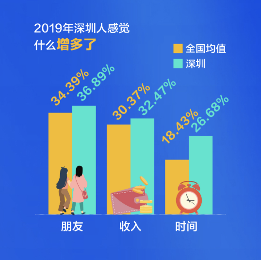 深圳人比較關(guān)注健康,不管是宅在家還是外出娛樂,他們選擇運動健身的比例都超過全國平均水平,對健康的投資,成就了又一個“苗條之城”。過去這一年,有四成的深圳人感覺自已“輕松”了,體重減少的人群比例高出全國近14個百分點。甩掉了贅肉的同時,深圳人還感覺在時間、朋友、收入這三方面的收獲在增加。尤其是時間,超出了全國均值8個百分點。