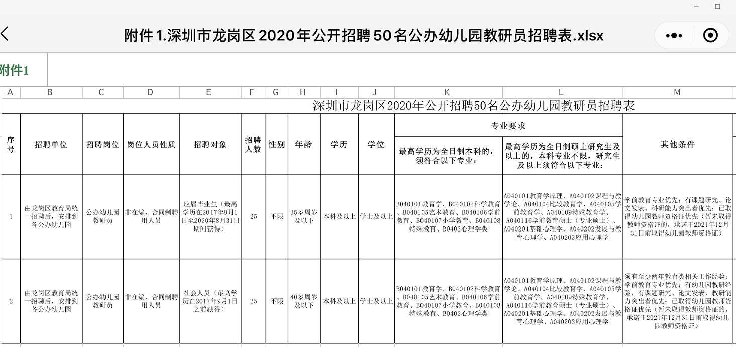 ■附:深圳市龍崗區(qū)2020年公開招聘50名公辦幼兒園教研員招聘表
