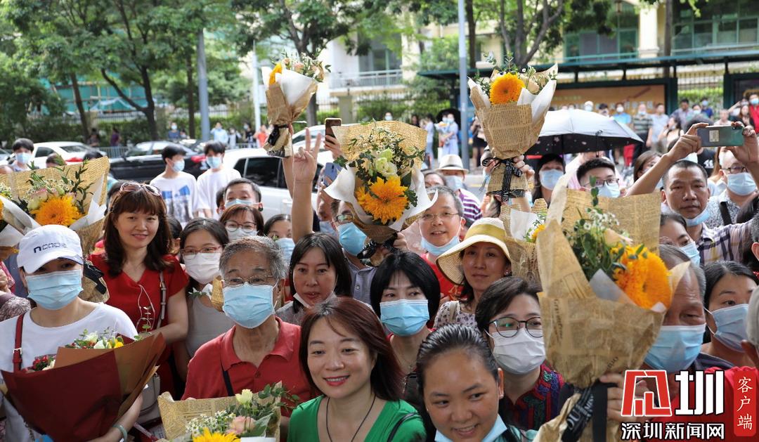 考生家長手拿向日葵,??忌慌e奪魁。