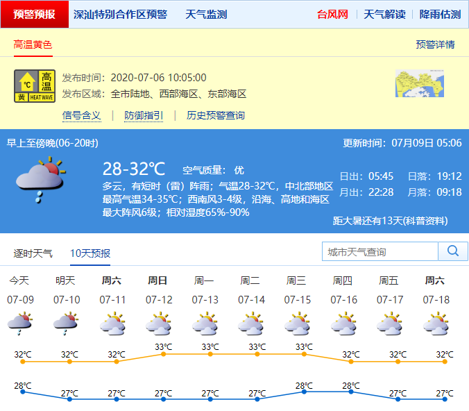 中午前后有陣雨;能見度普遍在10公里以上。全市(含深汕區(qū))高溫黃色預(yù)警信號(hào)生效中。中午前后有陣雨,出門最好帶把雨傘,防雨又遮陽。