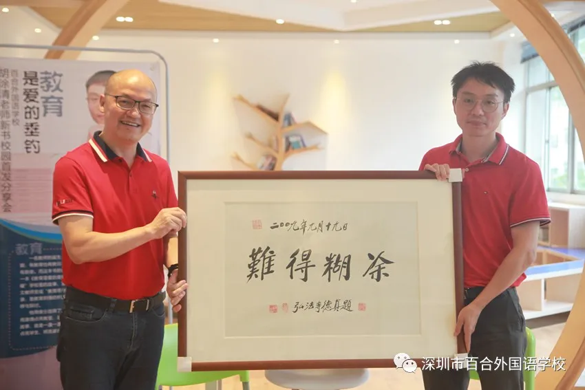 最后,朱正興校長(zhǎng)給胡涂清老師贈(zèng)送了一幅書法匾額作為“賀禮”,上面寫著“難得糊涂”。同時(shí),朱校長(zhǎng)也分享了自己的閱讀心得:“特別感謝胡老師,這是百外自成立以來(lái)第一位把自己的教育心路歷程以文字的形式集中展示給大家的老師,胡老師是我們的驕傲,也是我們學(xué)習(xí)的榜樣,是百外教育工作者的寫照縮影!胡老師對(duì)教育的堅(jiān)守,對(duì)夢(mèng)想的執(zhí)著追求,在重復(fù)輪回的工作中,做著統(tǒng)一卻又與眾不同的事,做成了教育詩(shī)歌,做成了教育散文。胡老師安靜卻不安分,清醒中保持一份糊涂,幾分激情,更有滿懷的豁達(dá)……”