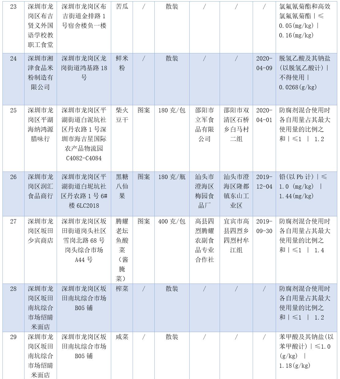 見圳客戶端·深圳新聞網(wǎng)2020年7月17日訊(晶報(bào)記者 鄧裴裴/制圖)7月17日,深圳市市場(chǎng)監(jiān)督管理局官網(wǎng)發(fā)布了2020年第二十二期食品安全抽樣檢驗(yàn)情況通報(bào),3-5月,共抽檢生產(chǎn)、流通、餐飲環(huán)節(jié)食品1229批次,發(fā)現(xiàn)不合格樣品47批次。記者注意到,不少不合格樣品抽檢單位為餐飲店,包括皇軒酒店、窯雞王、愛上牛蛙、御可奶茶等,還有些小吃店、腸粉店、螺獅粉店紛紛上榜。涉及不合格項(xiàng)目類別包括農(nóng)藥殘留、獸藥殘留、食品添加劑、微生物污染、品質(zhì)指標(biāo)、金屬等元素污染物。