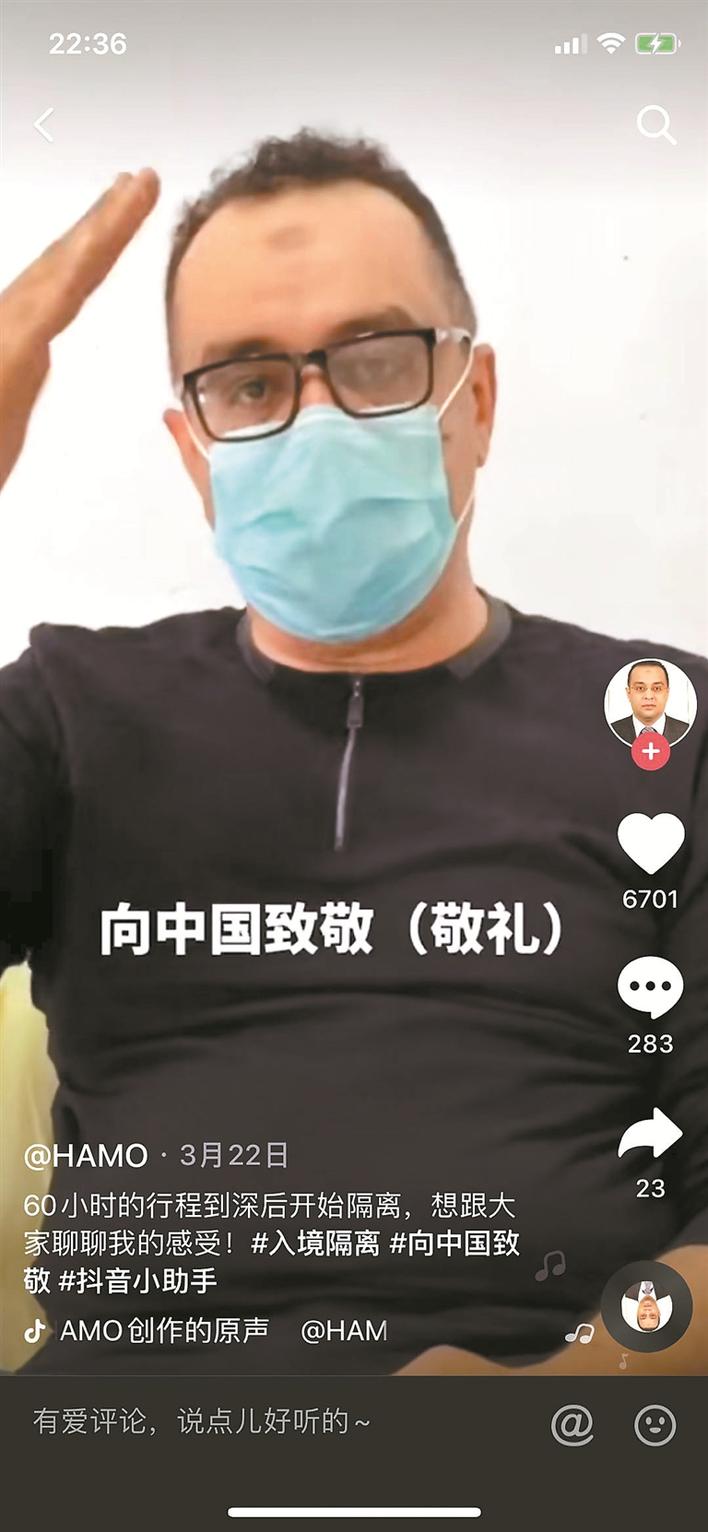 而在另一邊,方哈默也自愿當(dāng)起了中國防疫宣傳大使,他用短視頻在抖音記錄了中國抗疫暖心舉措,向國內(nèi)外宣傳羅湖各項防疫措施,截至目前,他在抖音已收獲了2.4萬的點贊量。網(wǎng)友們紛紛留下了暖心的鼓勵“謝謝你的理解”“歡迎你來到中國”。“我先生是個比較開朗的人,也很喜歡中國的生活環(huán)境,喜歡中國人,我們周圍的鄰居、朋友對我們很好,沒有因為現(xiàn)在的疫情就歧視外國人或不敢靠近。所以他的心態(tài)一直都不錯?!狈焦奶嬖V記者,其實,對于她的丈夫來說,中國已經(jīng)是他的第二個家鄉(xiāng)。在疫情發(fā)生以來,他一直孜孜不倦地向所有朋友分享著中國政府在此次疫情中所做的努力和貢獻(xiàn)。