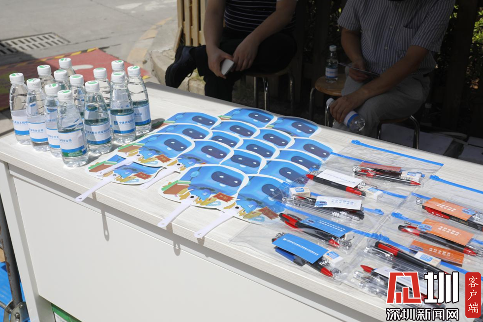為考生和門口等待的家長(zhǎng)準(zhǔn)備的文具包、風(fēng)扇和水。