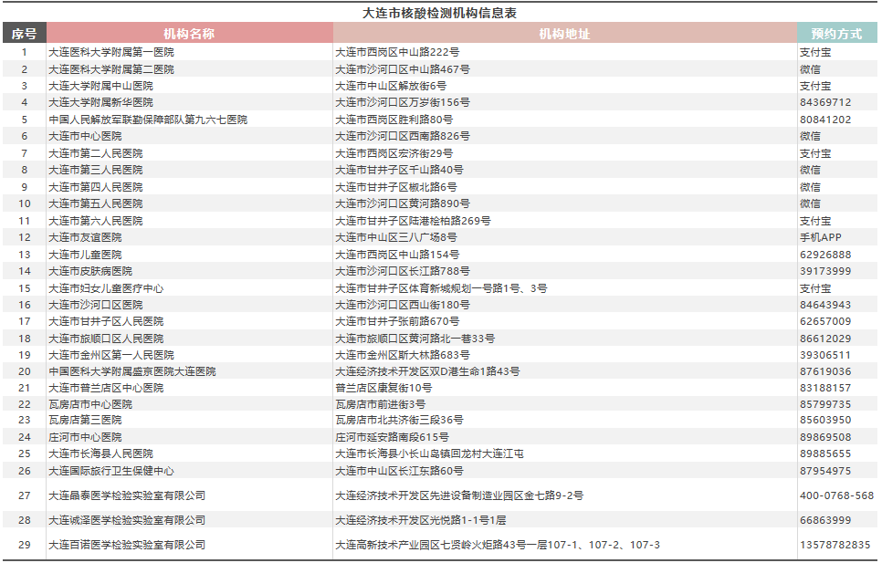 7月24日起,大連市人員原則上實(shí)施非必要不離連,確需離連的,須持7日內(nèi)核酸檢測陰性證明;冷藏冷凍肉品、海產(chǎn)品企業(yè)或場所從業(yè)人員盡快實(shí)施核酸檢測。大連市對(duì)外核酸檢測機(jī)構(gòu)現(xiàn)有29家,機(jī)構(gòu)地址和預(yù)約方式,市民可登錄大連市衛(wèi)生健康委官方網(wǎng)站進(jìn)行查詢。