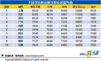 上海、北京、深圳、廣州這些一線(xiàn)城市的應(yīng)屆生平均起薪相對(duì)較高。一般而言,在各城市中,隨著學(xué)歷的提高,應(yīng)屆生起薪也會(huì)相應(yīng)增加。但由于職業(yè)或行業(yè)的人才缺口較大,使得某些職位盡管學(xué)歷不限或僅要求大專(zhuān)學(xué)歷,但其薪酬卻相對(duì)較高。例如,上海有的職位學(xué)歷不限或要求大專(zhuān)以上,但起薪要高于本科崗位,這也間接反映出應(yīng)屆生就業(yè)市場(chǎng)存在明顯的結(jié)構(gòu)矛盾。