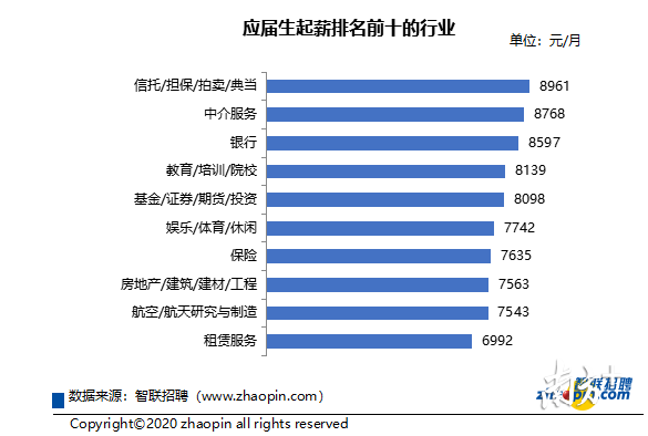 報(bào)告顯示,應(yīng)屆生起薪排名前十的行業(yè)中,信托/擔(dān)保/拍賣(mài)/典當(dāng)、中介服務(wù)、銀行等行業(yè)為起薪排名前三名,分別為8961元,8768元和8597元。除此之外,教育/培訓(xùn)/院校、娛樂(lè)/體育/休閑等受益于直播經(jīng)濟(jì)的帶動(dòng)和數(shù)字化的發(fā)展,也向應(yīng)屆生開(kāi)出了相對(duì)高的薪酬。