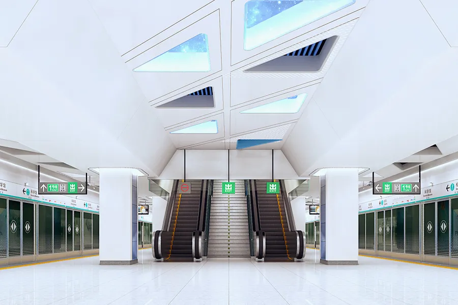 科學(xué)館站位于上步路與深南大道交叉口至濱河大道段,呈南北向布置。與1號(hào)線(xiàn)通道換乘,車(chē)站為地下三層單柱雙跨鋼筋混凝土框架結(jié)構(gòu),共設(shè)出入口6個(gè):E、F,物業(yè)口1、2、3、4。此外,與1號(hào)線(xiàn)換乘通道。