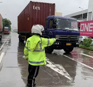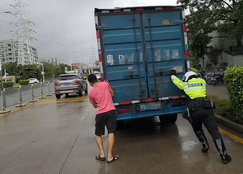 8月5日9時30分許,深圳交警鐵騎隊員雨中巡邏至新沙路時,發(fā)現(xiàn)德昌電機廠路段有一輛貨車停在路上,導致交通擁堵。貨車司機在旁,鐵騎上前詢問情況后得知貨車故障,司機被迫將車停在路邊。