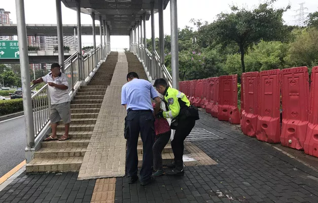 8月5日上午,深圳交警鐵騎巡邏至北環(huán)大道西往東方向珍珠嶺天橋路段輔道轉主道路口時,發(fā)現(xiàn)一位老太太躺在路中間。