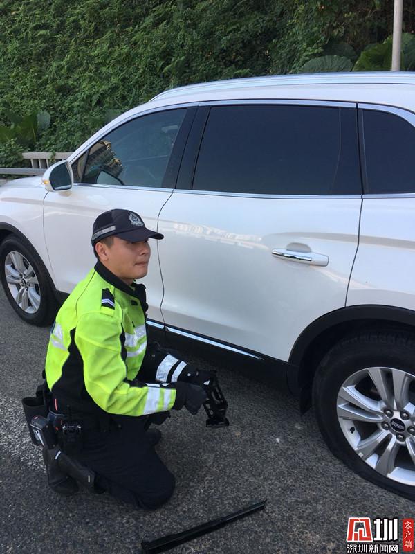 事情發(fā)生在10月11日早上10時30分許,劉先生駕車出外辦事,車輛行駛至東環(huán)高架西往東方向時,突然一聲巨響左后輪輪胎爆裂車輛半路拋錨,當時正值交通早高峰,過往車輛不斷,故障車輛停在道路中間導致路段交通擁堵,車主劉先生一時間不知所措,只能留在原地等待救援。此時正在執(zhí)行巡邏任務(wù)的羅湖交警鐵騎組長陳展廷見狀,立即停下警車上前查看情況,了解情況后,為了緩解該路段的交通擁堵,防止出現(xiàn)交通意外,陳展廷立即讓劉先生把車??吭谧钣覀?cè)車道,然后安排隊員用警車在故障車輛周邊設(shè)置出了安全警戒區(qū)域,另一位隊員則對過往車輛進行指揮疏導及勸慰駕駛?cè)瞬灰?,在安全區(qū)域等待,陳展廷則俯下身為爆胎車輛更換輪胎。約15分鐘的忙碌后,三位鐵騎隊員已滿身是汗,但在他們的密切協(xié)調(diào)配合下,快速幫助駕駛?cè)藙⑾壬鷶[脫困境,險情在最短時間內(nèi)被及時排除,道路交通秩序也恢復正常,這暖心一幕讓劉先生很是感動,緊緊握著陳展廷同志的手連聲表示感謝。
