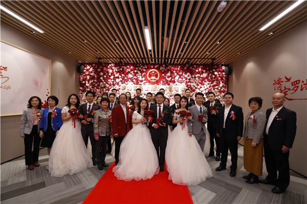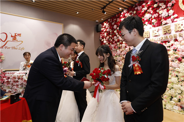 銀婚老人為12對新人頒發(fā)結(jié)婚證