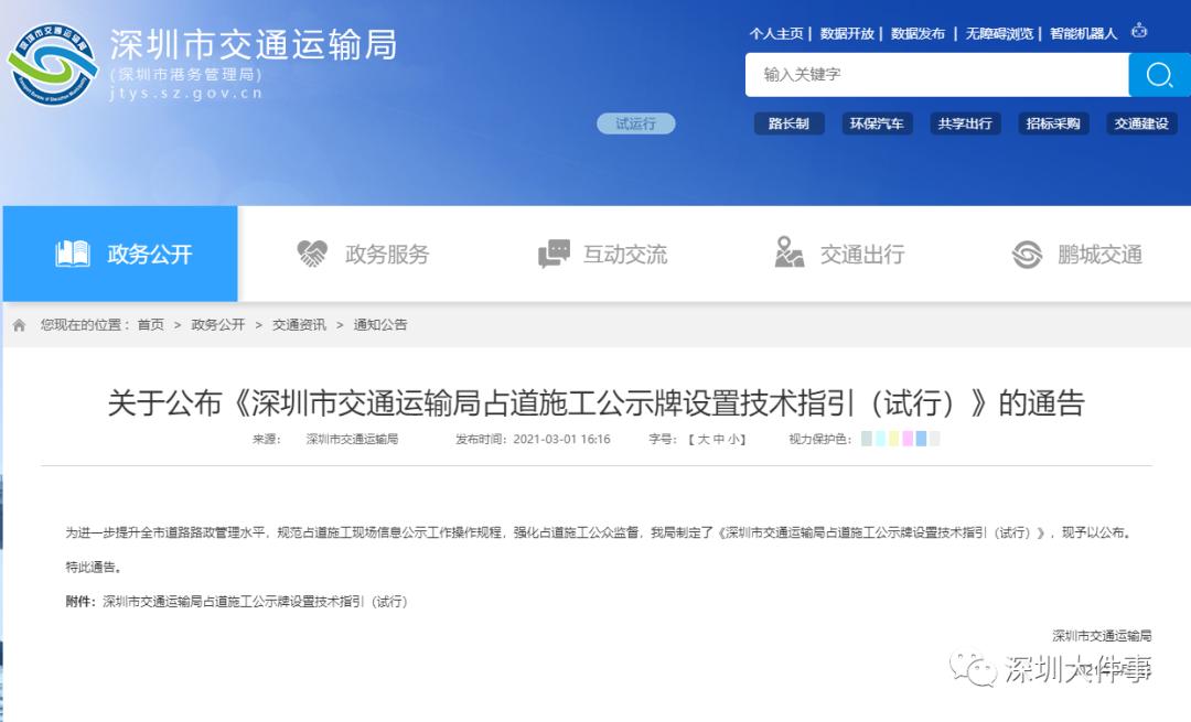 為加強道路管理,規(guī)范道路占用、挖掘行為,強化占道施工公眾監(jiān)督,深圳市交通運輸局編制了《占道施工公示牌設置技術指引(試行)》(以下簡稱《指引》),對占道施工公示牌設置要求,張貼范圍都有了明確的標準和要求。