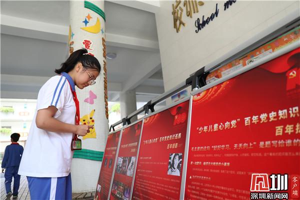 記者首先來到羅湖區(qū)翠北實(shí)驗(yàn)小學(xué),主題展板位于學(xué)校一樓大廳,有很多同學(xué)會在下課的時間來這里觀看學(xué)習(xí)。學(xué)校社工邱女士參與設(shè)計本次活動的時候想到,黨史對孩子們比較遙遠(yuǎn),想要讓孩子們深入學(xué)習(xí)就不能用大人的方式死板教條的灌輸,要調(diào)動孩子們的積極性,讓孩子們自己做“小講師”。