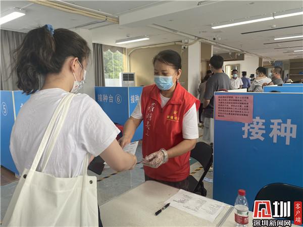 在新冠疫苗布心市場臨時接種點,前來接種的市民有序排隊,來自社區(qū)的工作人員和義工在各自的崗位上做好指引工作,引導市民了解疫苗接種的詳情和注意事項,并幫助他們在手機上提前進行了信息預登記,耐心為市民答疑解惑。65歲的義工成寶梅是一名深圳市五星級義工,此刻的她正在接種區(qū)域引導市民去接種臺,從早上九點到下午六點,她就這么一直站在崗位上,精神抖擻,笑臉迎人,絲毫不感覺累。成寶梅說道,“這個歲數(shù)了還能為這個社會發(fā)揮一些余熱,這是很有意義的一件事情,能聽到別人說的一聲謝謝,感覺什么都值得了?!?/p>