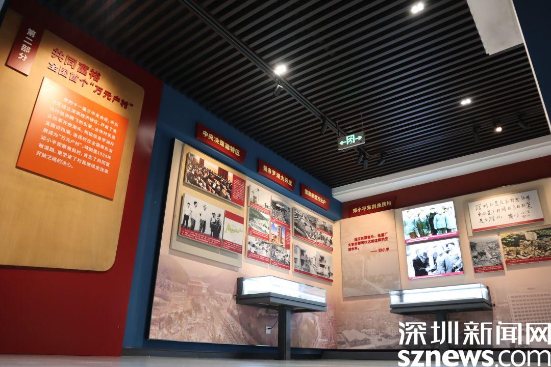 跟著直播鏡頭走過長達350米,共擁有28幅墻面浮雕的文化長廊,便是漁民村村史館的入口,步入村史館內(nèi),便是序廳,腳下是一副羅湖區(qū)地圖,大屏幕上,播放著8分鐘的《乘風(fēng)破浪再啟航》漁民村紀實片,全面展示了在中國共產(chǎn)黨領(lǐng)導(dǎo)下漁民村的發(fā)展歷程。