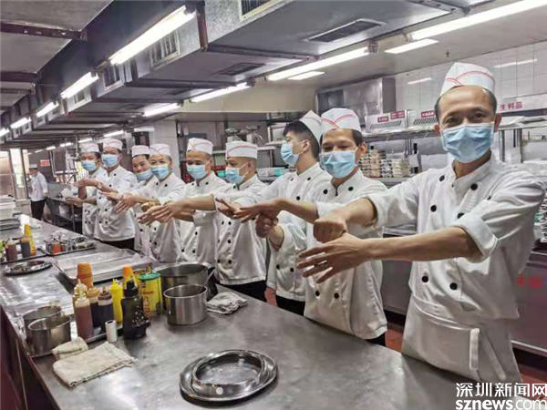 后廚人員正在學習“七步洗手法”。