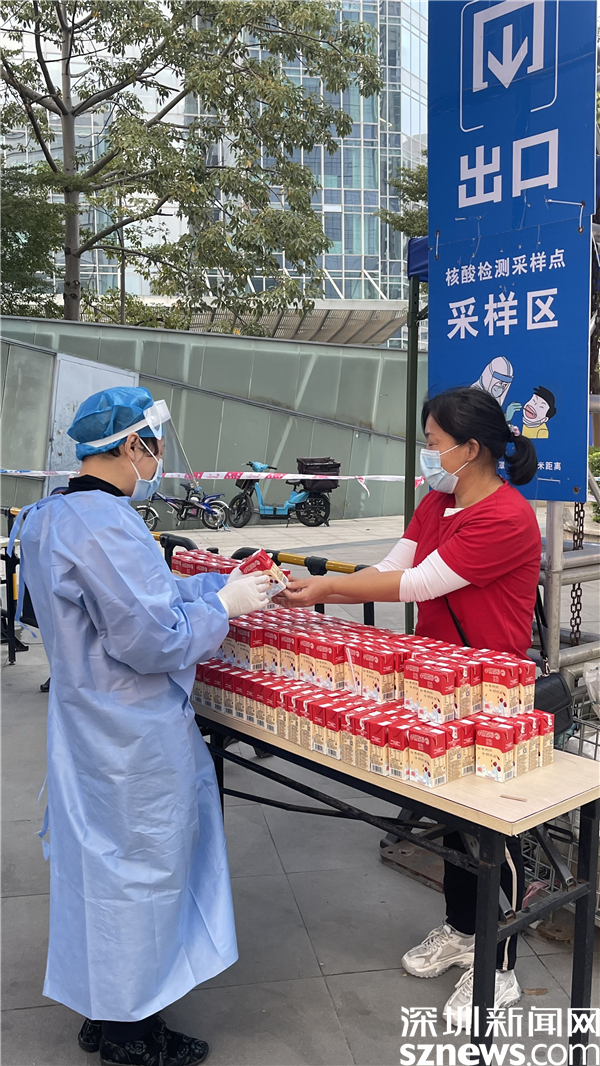 在筍崗街道初心公園核酸檢測點,市民在進(jìn)行核酸檢測后可以去領(lǐng)取一瓶牛奶。據(jù)了解,這是深圳愛心企業(yè)專門為市民和醫(yī)護(hù)人員捐贈的,這一瓶瓶牛奶在深圳的冬天向醫(yī)護(hù)人員和市民送上了一份溫暖。
