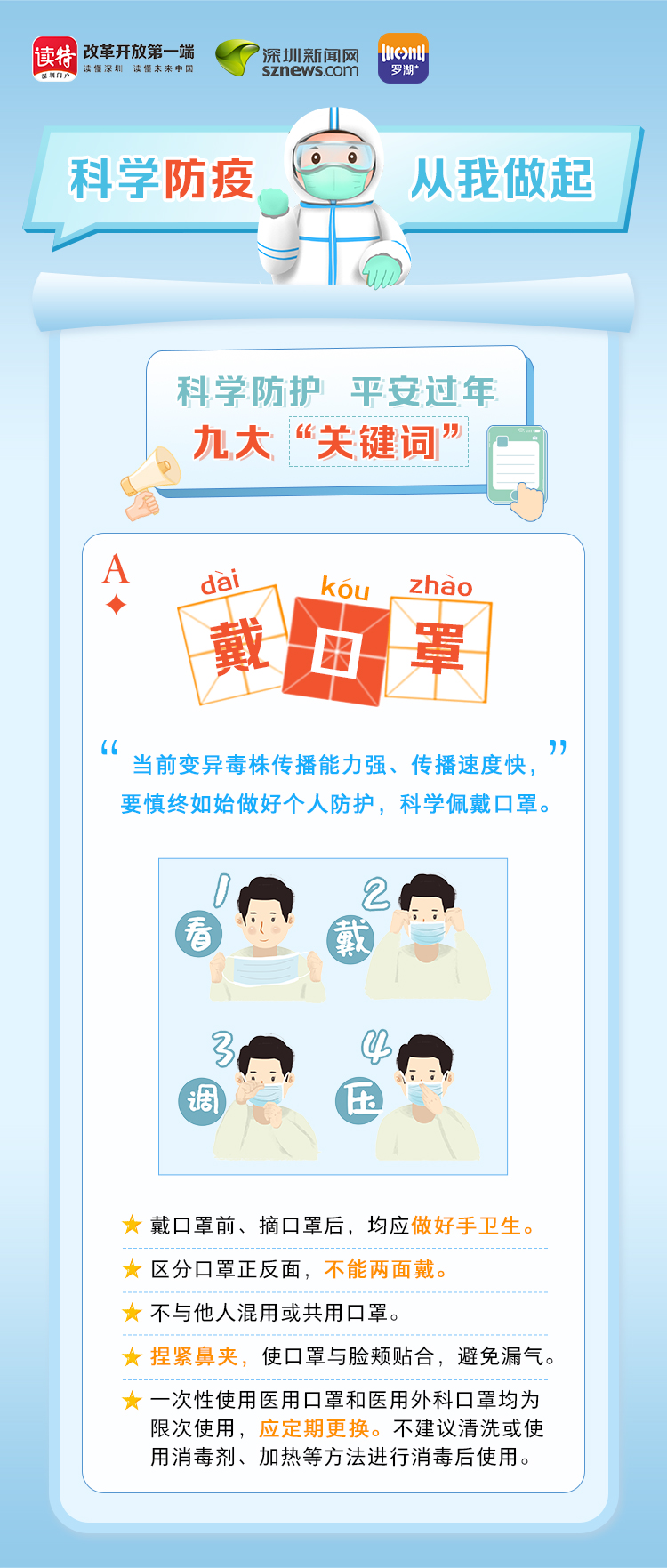 為更好地保護(hù)自己和他人的健康,度過(guò)一個(gè)祥和平安的春節(jié),請(qǐng)查收《科學(xué)防護(hù)平安過(guò)年九大“關(guān)鍵詞”》。在這場(chǎng)沒(méi)有硝煙的戰(zhàn)斗中,公安干警、醫(yī)護(hù)人員、社區(qū)工作者、志愿者始終堅(jiān)守在一線,齊心協(xié)力、眾志成城抗擊疫情。讓我們攜手并進(jìn),共同抗疫,采用科學(xué)有效的方式做好自身防護(hù),不僅對(duì)自己負(fù)責(zé),更是對(duì)家人負(fù)責(zé),對(duì)社會(huì)負(fù)責(zé)。