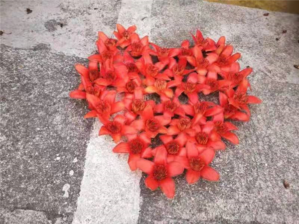可等到第二次站在樓上時(shí),我大吃一驚……原來(lái),在落英繽紛的路上,出現(xiàn)了幾個(gè)紅色的大字。木棉花平整地躺在地上,花瓣朝向天空,排列成“大白加油”四個(gè)大字!一旁,則是愛(ài)心,則是笑臉。那些小孩子開(kāi)心地站在一邊,臉上滿是燦爛的笑容,好像空中金色的陽(yáng)光一樣,時(shí)時(shí)閃現(xiàn)在我心頭……