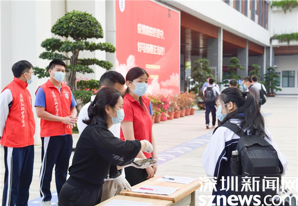 當(dāng)天早上,在羅湖高級(jí)中學(xué)校門口,學(xué)校老師、校醫(yī)、義工家長等早早來到校門口,迎接同學(xué)們的到來,每個(gè)同學(xué)都自覺戴好口罩,間隔一米距離,背著書包,拖著行李箱,進(jìn)入學(xué)校前出示校卡、粵康碼綠碼、行程卡以及24小時(shí)核酸陰性證明,并進(jìn)行衣物、行李、鞋底和手部消毒等。在經(jīng)歷了長達(dá)一個(gè)多月的線上課程后,同學(xué)們終于返回闊別已久的校園。突然開學(xué)是怎樣的心情?讓我們一起跟隨鏡頭直擊現(xiàn)場。