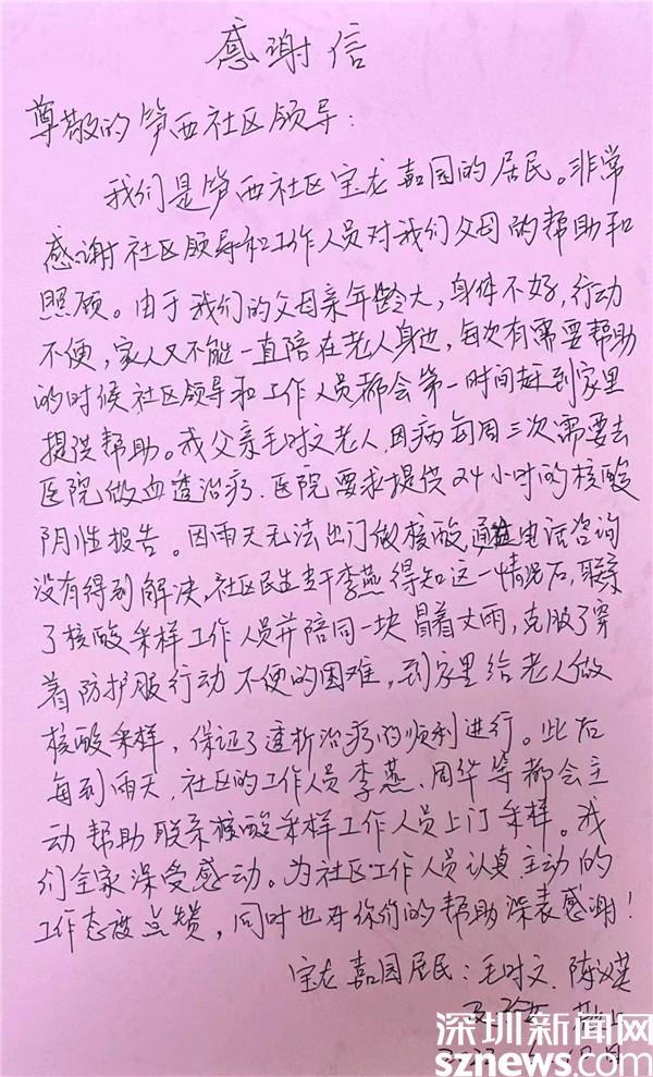 讀特客戶端·深圳新聞網(wǎng)2022年6月13日訊(記者 劉嘉敏 通訊員 李秀甜)近日,羅湖區(qū)筍崗街道筍西社區(qū)寶龍嘉園住戶毛時文的老伴陳漢英阿姨來到筍西社區(qū)工作站,送上了一封手寫的感謝信,感謝社區(qū)提供貼心的上門核酸采樣服務(wù)。