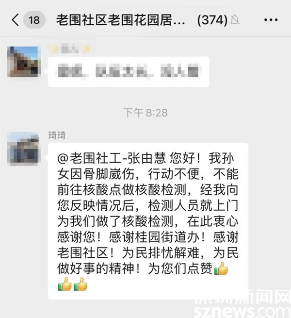 讀特客戶(hù)端·深圳新聞網(wǎng)2022年7月14日訊(記者 劉嘉敏 通訊員 楊紀(jì)歐)7月12日晚上8點(diǎn)多,羅湖區(qū)桂園街道老圍社區(qū)的居民琦琦在居民微信群里向社工張由慧說(shuō):“您好!我孫女因骨腳崴傷,行動(dòng)不便,不能前往核酸點(diǎn)做核酸檢測(cè),經(jīng)我向您反映情況后,檢測(cè)人員就上門(mén)為我們做了核酸檢測(cè),在此衷心感謝您!感謝桂園街道辦!感謝老圍社區(qū)!為民排憂解難,為民做好事的精神!為你們點(diǎn)贊?!?/p>