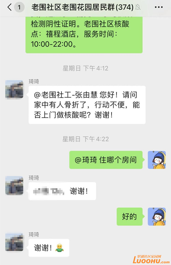 事情還要從7月10日的下午說(shuō)起,正在家休息的張由慧,看到琦琦在社區(qū)居民群里求助:“@老圍社工-張由慧?您好!請(qǐng)問(wèn)家中有人骨折了,行動(dòng)不便,能否上門(mén)做核酸呢?謝謝!”張由慧立刻回復(fù):“您的房間號(hào)(是什么)?”得到房間號(hào)后,張由慧通知社區(qū)網(wǎng)格員肖祥昌協(xié)助核實(shí)情況。肖祥昌從網(wǎng)格系統(tǒng)中找到琦琦的聯(lián)系方式,一通電話后,了解到琦琦的孫女不小心崴傷了腳,行動(dòng)不便,無(wú)法下樓做核酸。肖祥昌把情況通報(bào)給張由慧,張由慧立刻向社區(qū)黨委副書(shū)記黃小龍做了報(bào)備。