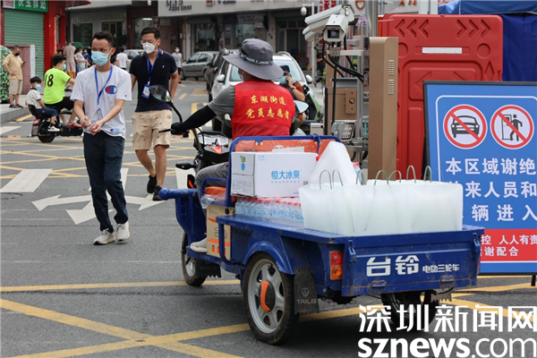 在新平村口,記者看到村口外圍已用水馬進行合圍,來自街道、疾控、社區(qū)還有大望實業(yè)股份有限公司、梧桐山實業(yè)股份有限公司等單位的工作人員正在準備開展工作。在合圍的多個出入口處設置了快遞、外賣投放點,由防疫人員為中、高風險的居民送貨上門。