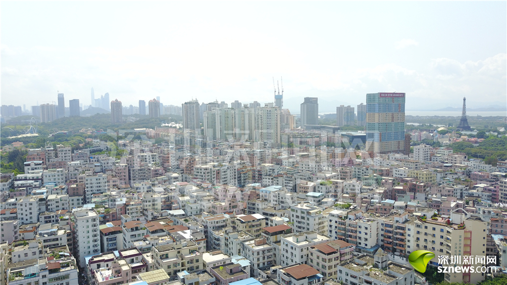 從白石洲低矮的“握手樓”上空看去,世界之窗標(biāo)志性建筑“埃菲爾鐵塔”依稀可見