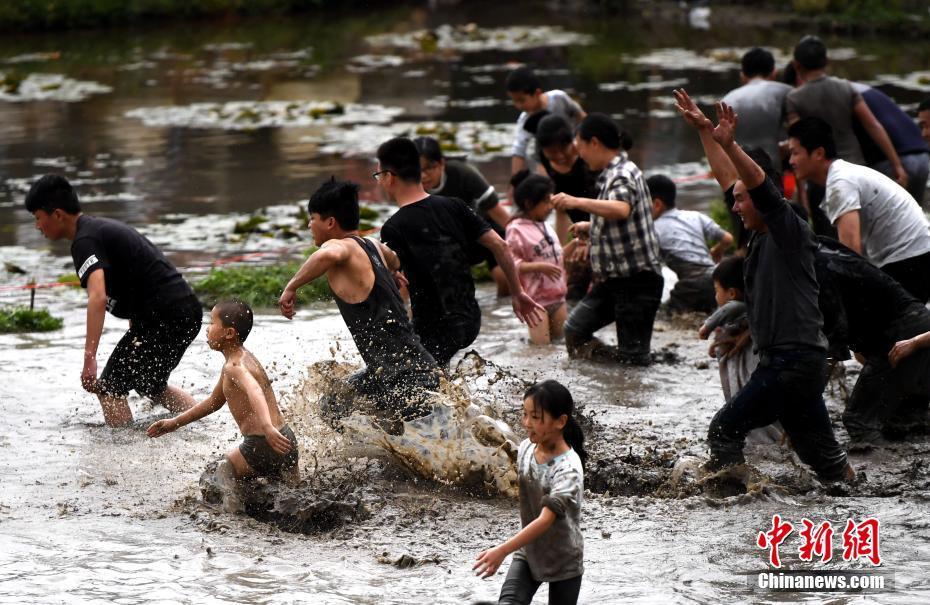 3月17日,福建省龍巖市連城縣莒溪鎮(zhèn)璧洲古村落內,一場“抓魚鬧春田”的活動吸引了許多市民前來參與。圖為民眾在泥塘中奔跑搶魚。中新社記者 張斌 攝