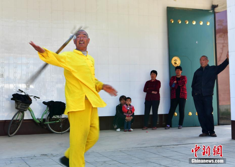 4月11日,在河北趙縣何莊,農(nóng)民蘇煥未(左一)的“滾鋼叉”技藝表演吸引了圍觀者的眼球。67歲的蘇煥未出身武術(shù)世家,自幼練就一手出神入化的滾鋼叉絕技。滾鋼叉又叫鋼叉舞、耍鋼叉,以表演驚險著稱。老人的表演出神入化,鋼叉能耍出空中飛叉、滾蹚紅、金鉤釣魚、穿脖穿腰等十幾種花樣。蘇煥未表示,滾鋼叉因為練習(xí)非常辛苦,很少有年輕人愿意學(xué),他希望該民間技藝得到相關(guān)部門保護。中新社記者翟羽佳 攝