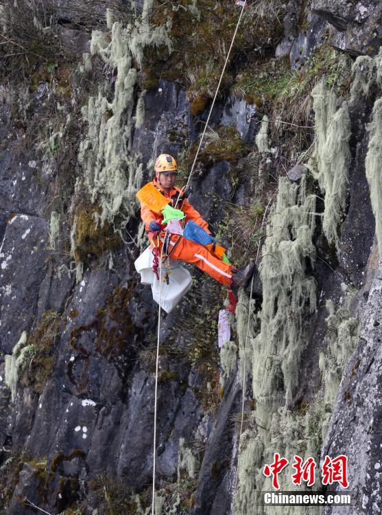 5月1日,四川峨眉山,樂山山地救援隊隊長王麒正在清理峨眉山金頂崖壁上的垃圾。中新社記者 劉忠俊 攝