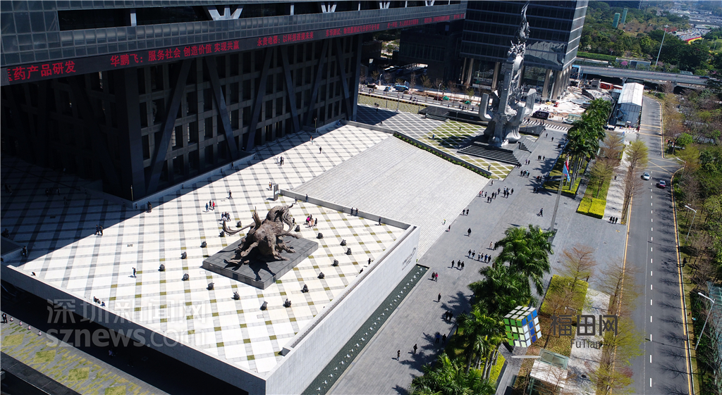 深交所由方正的塔樓和空中懸挑的裙樓所組成,大廈底座被抬升至30多米形成一個巨大的“漂浮平臺”。