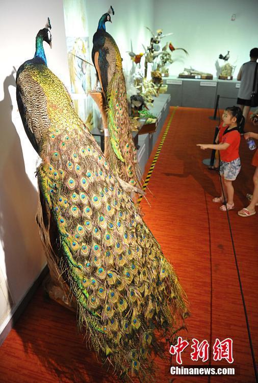 5月27日,各類飛禽走獸活靈活現(xiàn)地出現(xiàn)在民眾的眼前。正在福建博物院展出的第四屆中國(guó)動(dòng)物標(biāo)本大賽的257件惟妙惟肖的標(biāo)本作品集中對(duì)外開(kāi)放,讓民眾如進(jìn)入“動(dòng)物世界”。本次大賽匯集了全國(guó)標(biāo)本制作企業(yè)、博物館、大專院校、研究所等60多家單位參加,標(biāo)本涵蓋哺乳類、鳥類、爬行類、兩棲類、魚類等動(dòng)物類群的皮張和骨骼標(biāo)本。主辦方希望通過(guò)標(biāo)本大賽,向公眾展現(xiàn)動(dòng)物世界的美麗,宣傳生物多樣性和生態(tài)文明,借鑒吸收國(guó)際標(biāo)本制作先進(jìn)經(jīng)驗(yàn),提高中國(guó)野生動(dòng)植物標(biāo)本制作的整體水平。圖為大賽參賽的孔雀標(biāo)本。中新社記者 張斌 攝